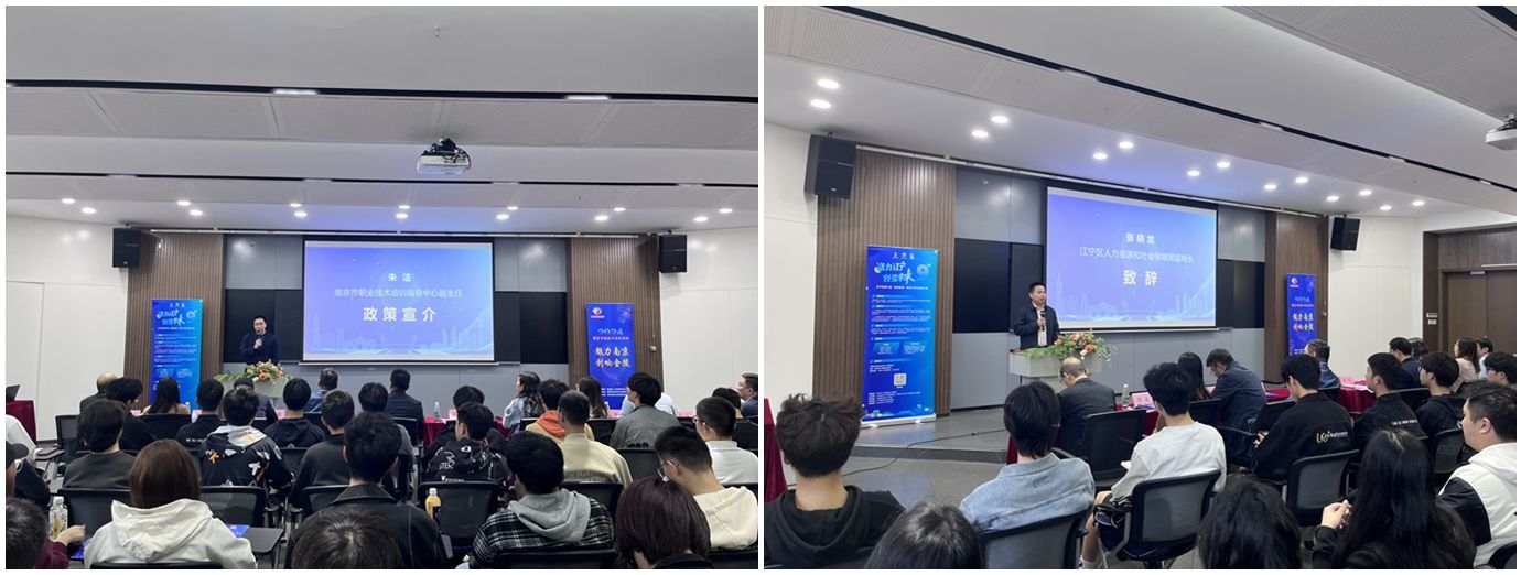 活动中,南京市职业技术培训指导中心和区人社局工作人员分别就南京市创业培训政策、江宁区区情和“梧桐林杯”青年大学生创业大赛奖励扶持政策向全体参会人员做详细解说,并勉励在场学生要勇立双创潮头,成为南京引领国家创新型城市建设的参与者、奋进者、实践者。