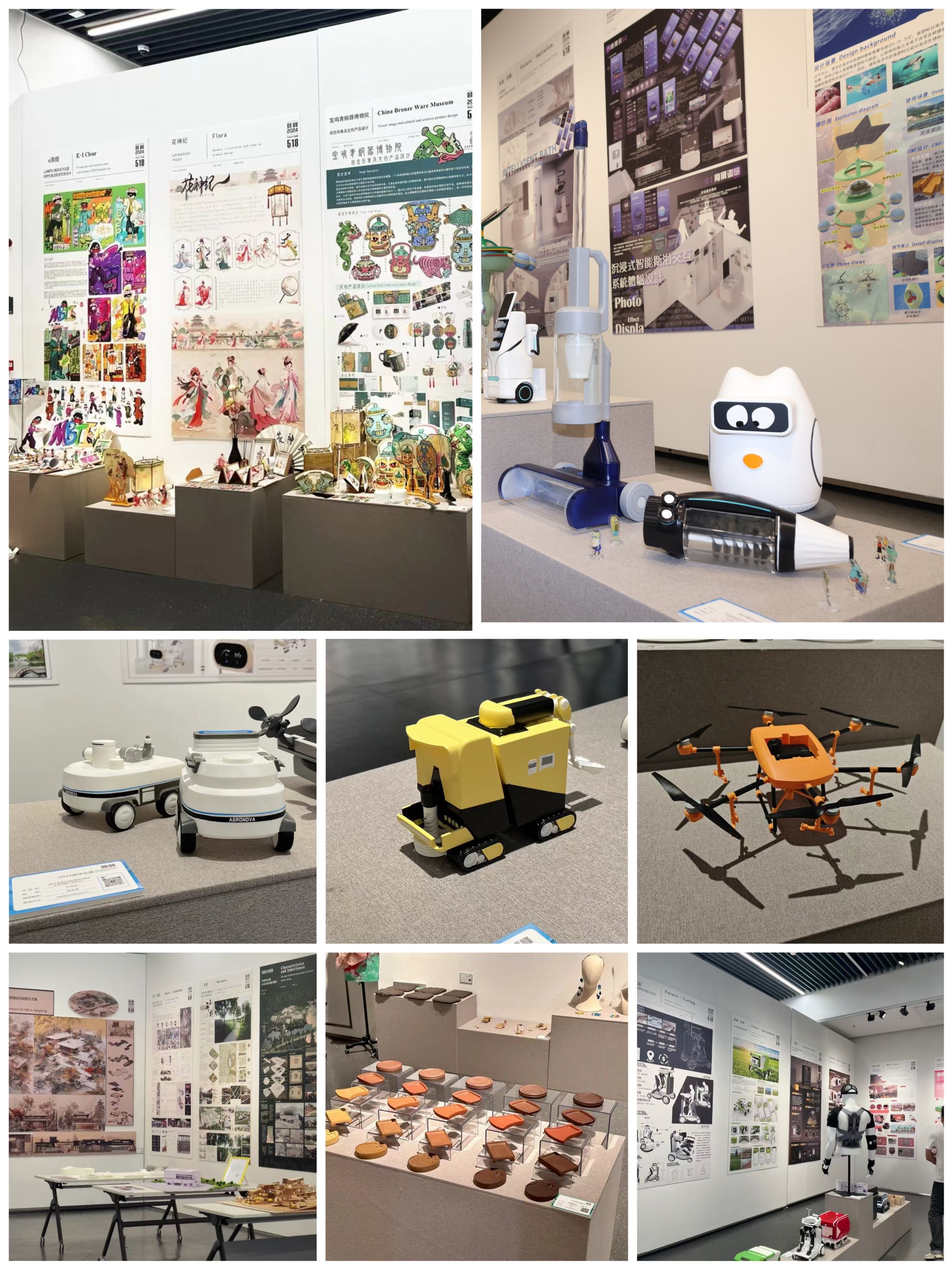 本次毕业展共汇集了产品设计、工业设计、视觉传达设计、环境设计、工艺美术和动画等六个专业279名学生的优秀作品。同学们通过调研、实验、设计,将所学知识与实际问题相结合,提出了许多具有创新性和实用性的解决方案,其中不仅有传统绘画与现代数字技术的完美融合,也有虚拟现实等前沿技术在艺术创作中的巧妙运用。视觉传达设计专业陈秋妍小组的作品《古韵新生·四季问候——二十四节气可视化表达》,将节气文化进行现代化、可视化系统设计,构建出节气文化的可视化体验,弘扬中国传统文化;产品设计专业周逸凡同学的作品《一体式智能家居清洁机器人》,采用先进的传感技术、机器视觉和人工智能算法,实现地面清洁和垃圾收纳全方面智能化,提升用户的生活品质和幸福感;动画专业蒋零小组的三维动画《寻真之旅》,以多维度和交叉融合方式,更加完善地展现剧情、表达观点;工业设计专业杜方茗同学将太极拳这一传统体育运动与现代智能穿戴医疗设备结合,凭借VR虚拟现实的运动捕捉技术,设计的智能脊柱康复设备让参观者眼前一亮。