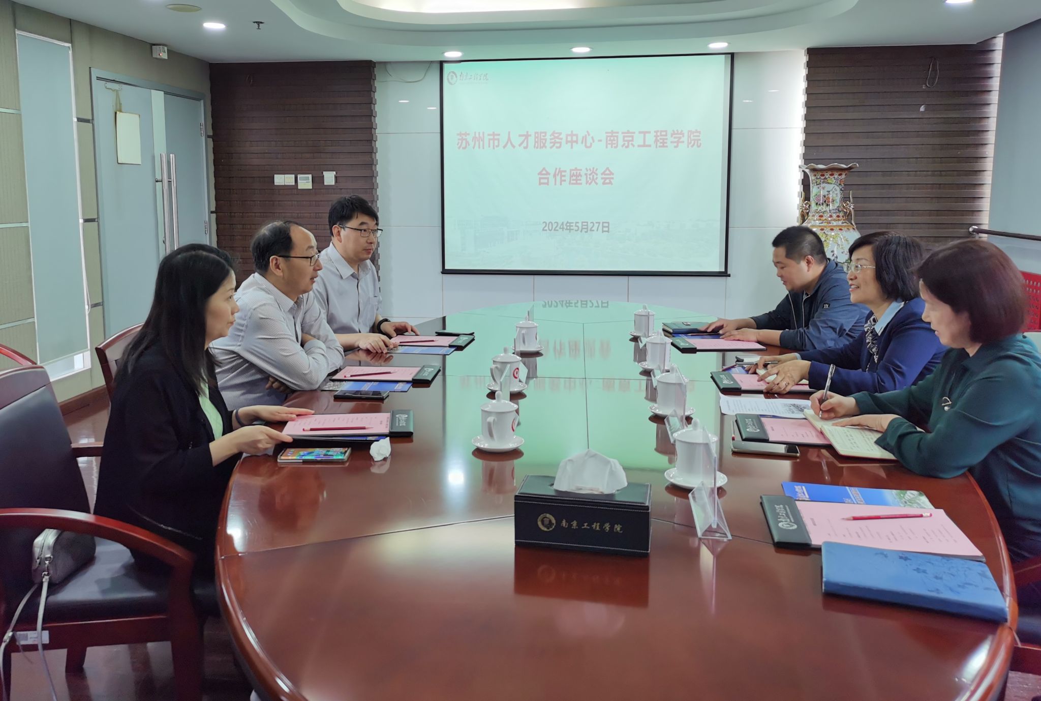双方就在校内建立苏州人才驿站进行了沟通,达成了共识,希望以此作为南工程学子领略苏州发展新成就和人文环境的“窗口”,在地方政企与青年学子之间建立联系交流长效机制。学生工作处相关负责人参加座谈会。