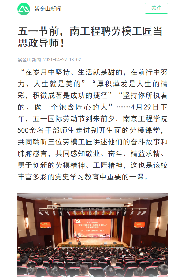 《紫金山新闻》:五一节前,南工程聘劳模工匠当思政导师!