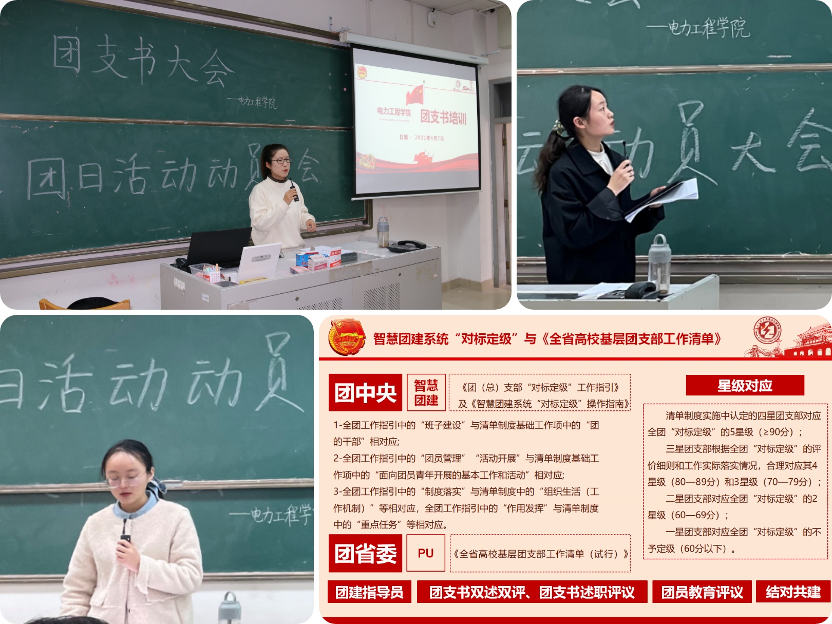 4月7日,该院在东馆A101教室开展“学党史,强信念,跟党走”团支部书记理论培训暨团日活动动员大会。会上,该院学生工作负责人就团支书的基本要求和主要职责,从“推优工作”“青年大学习”“对标定级与团支部工作清单制度”“基础团务”“团日活动和党史教育”等方面进行了理论素养培训,引导团支部干部立足主题,紧抓重点,开动脑筋,多形式有效开展党史学习活动,努力让党史学习在团员青年中成为一种常态。电力184班团支书表示:“此次培训让我认识到自身工作中的一些问题,身为团支书,感觉责任重大,会后要继续加强理论知识学习,带领全班学好党史、坚定信念。”