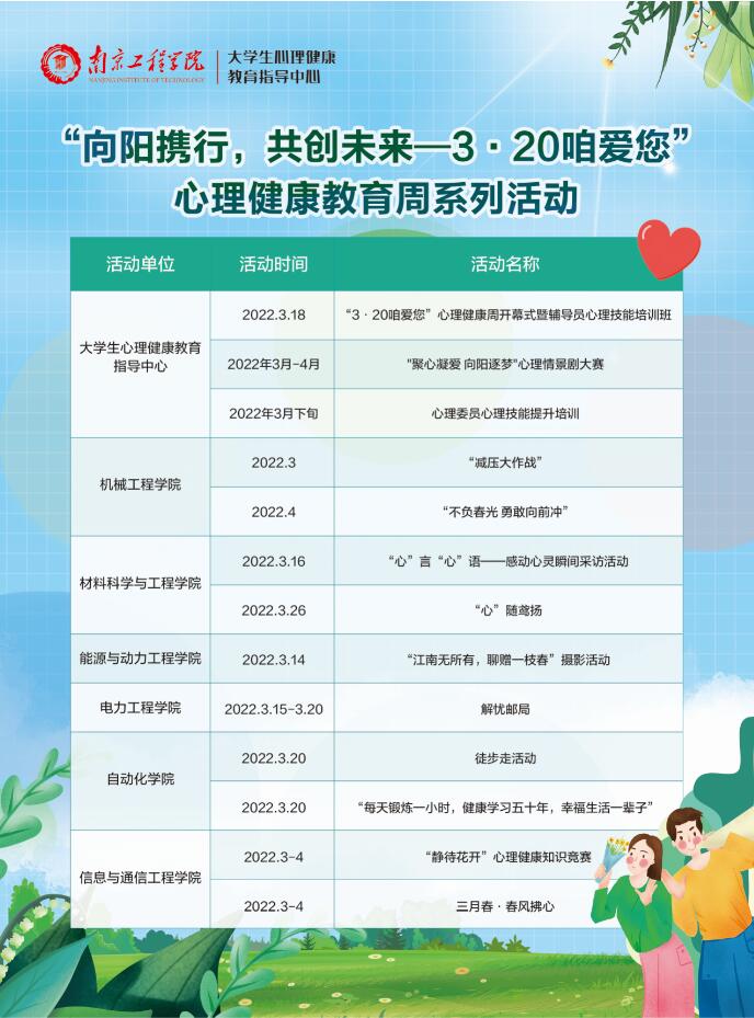 为加强心理育人工作建设,健全凯发心理健康教育网络,构建温暖和谐育人环境,营造积极健康校园文化,近日,我校开展“3?20咱爱您”心理健康周主题系列活动,本次活动由校大学生心理健康教育指导中心联合学院心理辅导站开展,以“向阳携行,共创未来”为主题,得到了全校师生热烈的响应与积极参与。